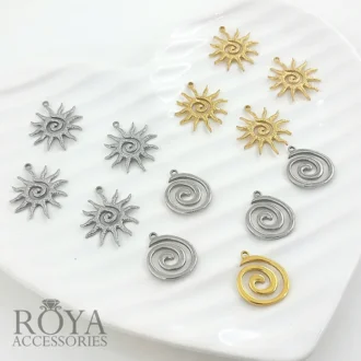 - پلاکهای اسپیرال دایره و خورشید، مناسب ساخت گردنبند و اکسسوریهای دستساز با حس بوهو و انرژی مثبت 🌞🌀