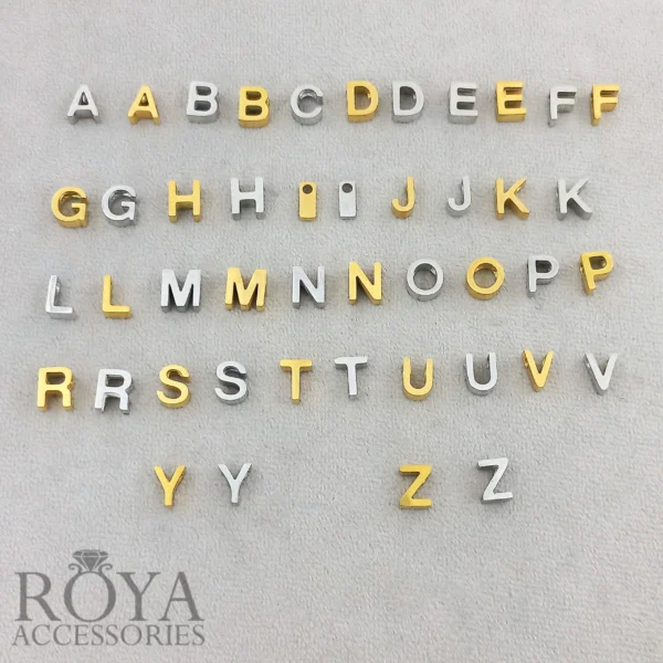 ابعاد همه حروف زیر 1 سانت و حدودا 8 میلی متر هست. سوراخ حروف در وسط به بالا زده شده و برای دستبند بیشتر استفاده می شود. برای گردنبند حروف بزرگ تر داخل سایت موجود می باشد.